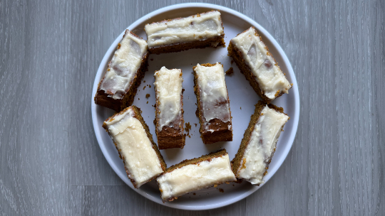 Start your feast with some pumpkin spice bread topped with cream cheese frosting that perfectly complements the fall spices. Maple syrup helps add sweetness while cutting down the amount of added sugar.