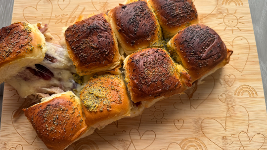 Here’s a hack for those intimidated by cooking a turkey: Many grocery stores sell roasted turkey breast in the same section as rotisserie chickens. That’s what we used for these sliders, which made it much easier to prepare – perfect for a big party!