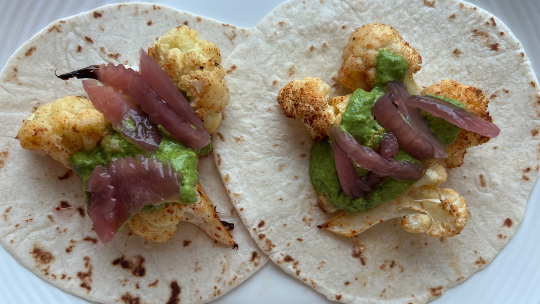 Assemble tacos by topping tortillas with cauliflower, sauce, and pickled red onions. Makes 2 servings.