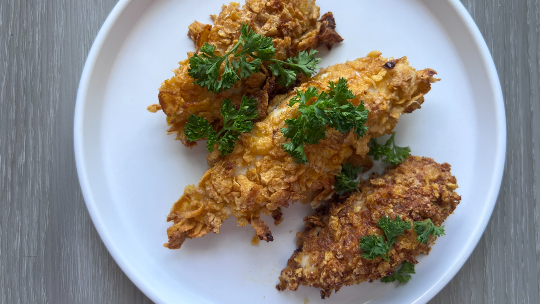 Whenever I go to a University of Hawaii at Manoa football game, I typically have a tray of chicken tenders and garlic fries as I’m cheering on the ‘Bows. This combination of chicken with crunchy cornflakes is a healthier option than fried chicken, and it’s easy to make at home!