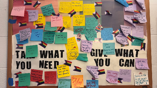Instead of lattes and iced coffees, a large corkboard is filled with colorful, positive sticky notes sharing words of encouragement: Remember we love you. You’re doing amazing; keep going. Thank you for existing in every space you are in.