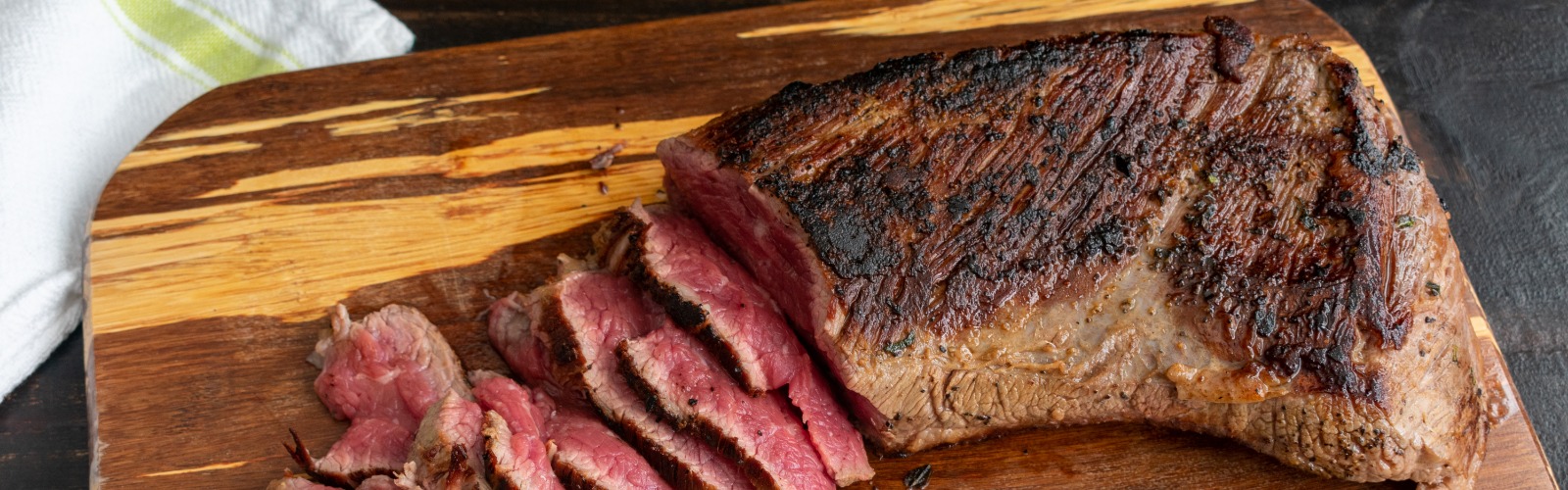 Pro tip: The grain in a tri-tip roast changes direction, so before cooking, check each part of the roast to see the direction of the “grain” — the long strands of muscle fiber. After cooking and letting it rest, slice the roast in two where the fibers change direction. Carve each piece separately against the grain.