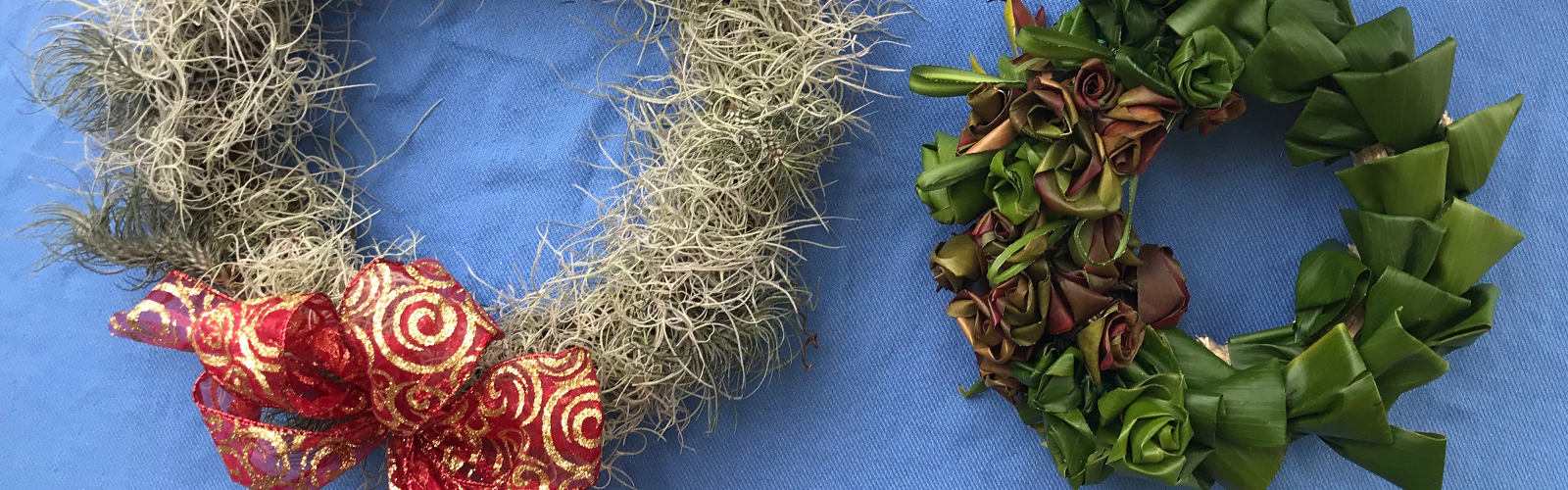 Note: Instead of purchasing a grapevine wreath, you can create your own using lilikoi vine. Artificial versions of the plants can be used and are available at most craft supply stores.