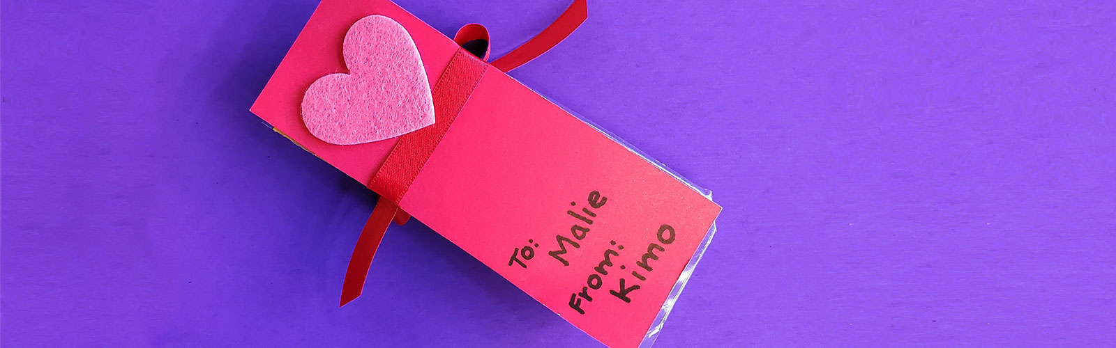 Place card on back of package and secure with ribbon. Place a sticky-back heart at the top of the card and on the ribbon (to hold it in place).