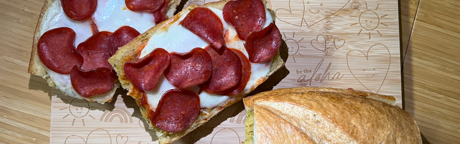 Slice loaf in half to create two large sandwiches. Spoon sauce inside and top with cheese and pepperoni. Bake at 350 degrees F until crisp and cheese is melted, 3-5 minutes.