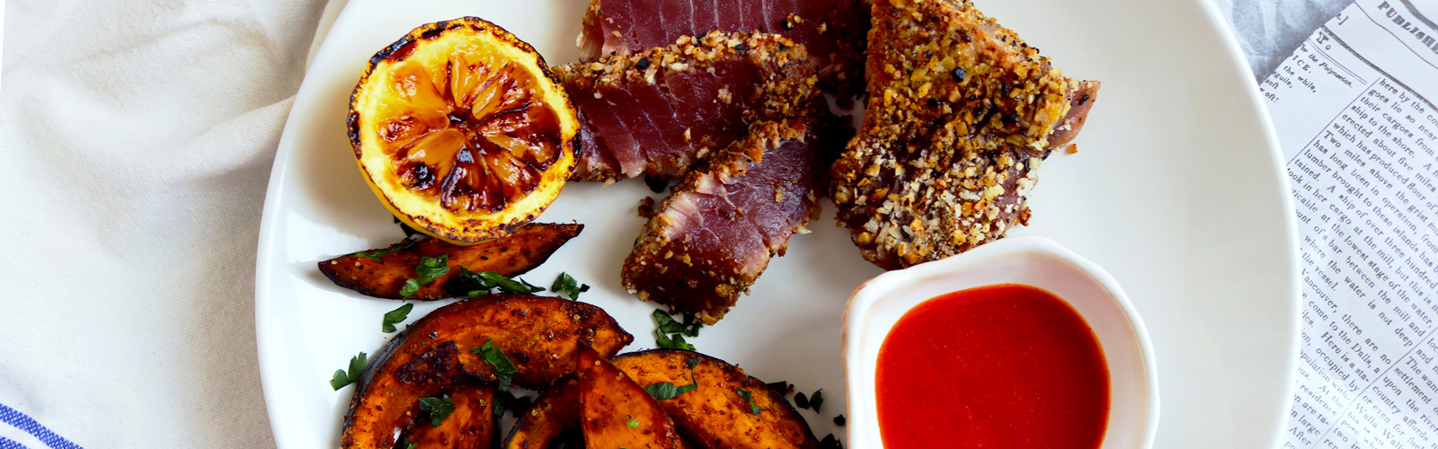 Plate ahi with kabocha chips and garnish with a fresh lemon slice. Serve with sauce of choice. Makes 4 servings.