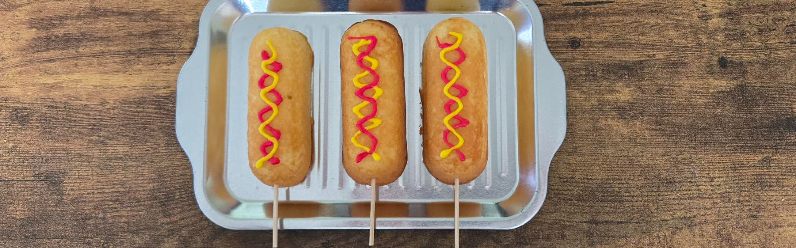 Place sponge cakes on serving tray or plate. Stick wooden skewer through the bottom. Use food coloring to mimic ketchup and mustard on top. Serve and enjoy!
