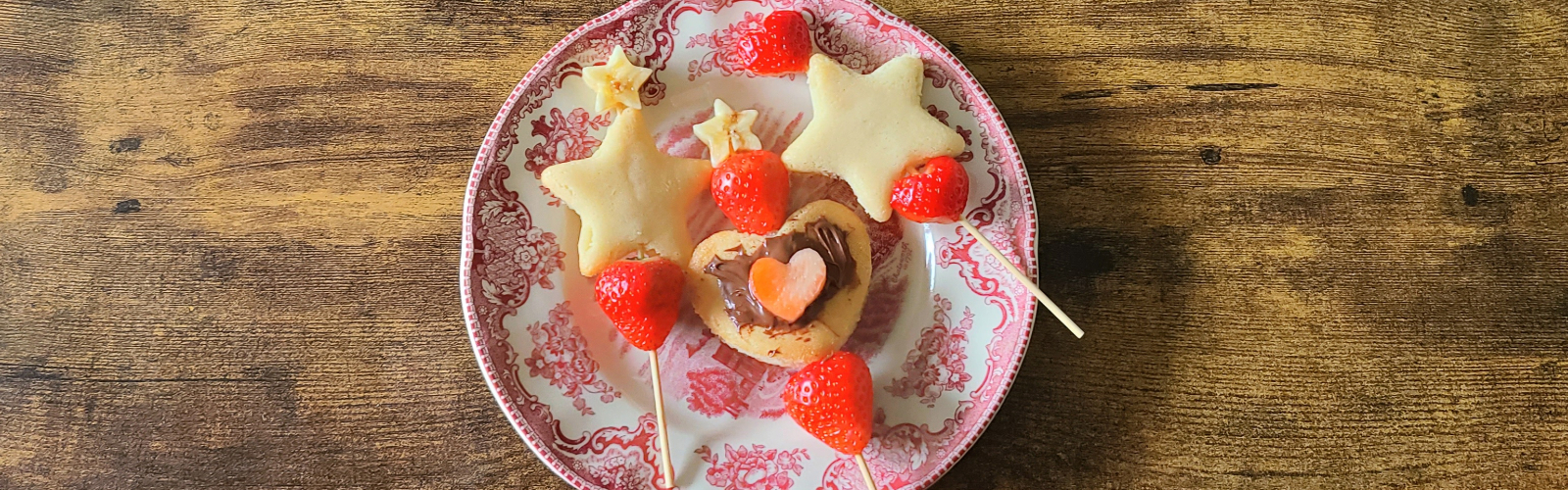 Slice strawberries and bananas. Use cookie and canape cutters to make pancake, strawberry, and banana shapes, if desired. Layer strawberries, bananas, and pancakes on skewers. Add hazelnut spread.