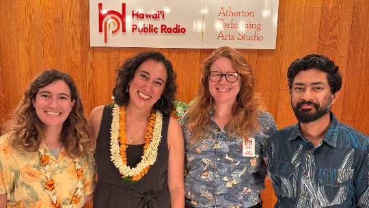 HPR Executive Producer for The Conversation Maddie Bender with author Nikki Van De Car and Kyla Herrmann, Ananddev Banerjee at HPR's Live from the Atherton. Photo courtesy Sylvia Flores