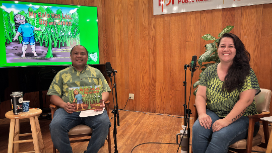 HPR Managing Editor Jason Ubay with author Pua Aquino at HPR’s Live from the Atherton. Photo courtesy Sylvia Flores