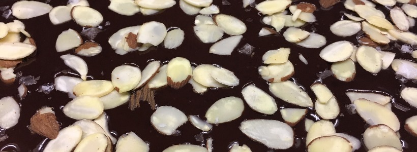 In a small saucepan over medium heat, bring coconut milk to a boil. Pour over chocolate and stir until completely smooth. Pour onto crust and top with sliced almonds and sea salt.