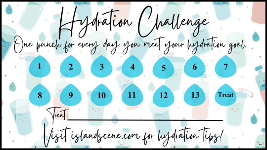 Hydration challenge: Whether your goal is to drink 8 cups a day, a certain amount per hour, or simply choosing water over soda, track it on your punch card!