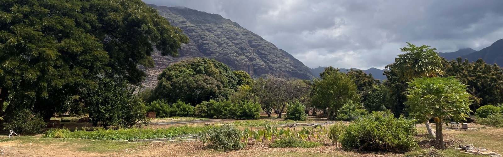 Framed by the Waianae mountains, the once barren landscape is now filled with an orchard bursting with produce – olive, cashew, and macadamia nut trees share the space along with fruit trees like jabong, jackfruit, soursop, Surinam cherries, and mango. Sugarcane, gandules, and cassava grow in abundance. Rows of planter boxes are stuffed with vegetables like daikon and kale, and herbs like mint and cilantro. A kitchen and solar pizza oven were built on-site to experiment with ingredients from the farm.