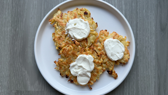 Potato latkes are a traditional dish typically eaten during Hanukkah. They’re crispy on the outside and creamy on the inside. While you can use fresh Russet potatoes, we opted for frozen shredded hash browns to save time on peeling and grating.