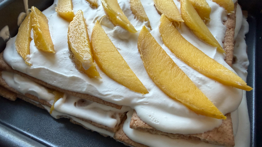 Line an 8-by-8 dish with layer of graham crackers. Pour ¼ of cream mixture on top and spread evenly. Arrange mango slices on top. Repeat process until 4 layers are formed.