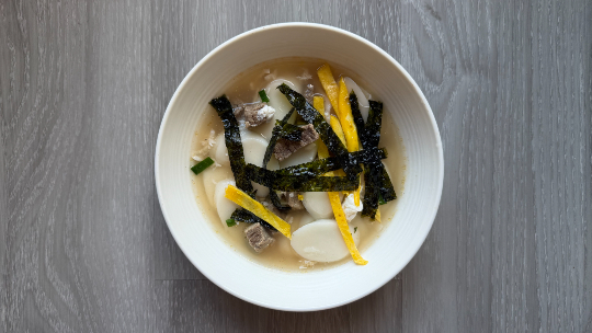 Add rice cakes and Joseon ganjang to soup pot and stir. Cover pot. Cook for 7-8 minutes, or until rice cakes float. Gradually pour in egg whites and cook for about 30 seconds until cooked through.