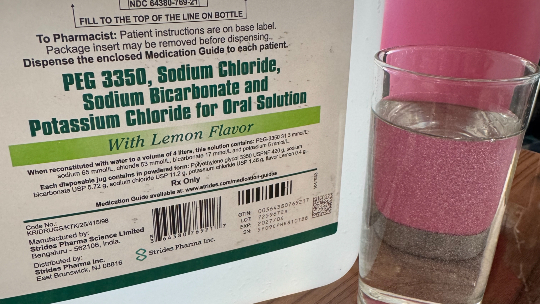 A few days later, my doctor’s office referred me to an outpatient facility. They called me to schedule the procedure; review a pre-procedure questionnaire; and prescribe the prep. To my surprise, everything moved quickly, and the colonoscopy was scheduled within two weeks following my doctor’s visit. Now it was time to pick up the prep from my pharmacy and prepare. In my case, I was prescribed a jug of polyethylene glycol 3350, a powdered laxative used to cleanse the bowels.