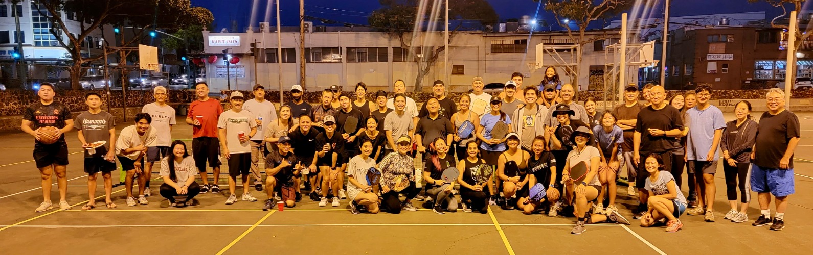 Post-pandemic, the group needed a new place to play and found parks around the island that have mixed-use courts. Today, their regular meetup features players of all skill levels. “We’ve always been open,” Osada says. “We sometimes have a newbie court, an intermediate court, and an advanced court going on. We’ve even started a court for injured people, where no running is allowed.”