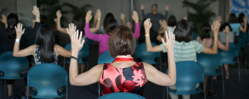 The small class grew once it officially became a wellness project under HMSA’s innovation center. Through practice and research, the class developed from a standard power yoga class into a class that incorporated restorative elements through chair yoga.