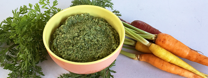 Pesto. Quick and easy to prepare, it’s the perfect summertime food. In minutes you can whip up a delicious pasta sauce, dip, or sandwich spread. My favorite is one made with carrot tops and a bit of basil. It’s a wonderfully mild pesto and a great way to use up all parts of your carrot!