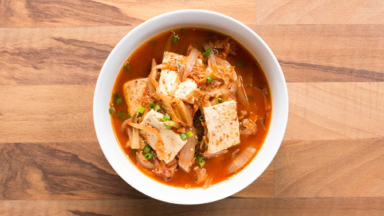 This comforting staple of Korean cuisine, known as kimchi soondubu jjigae, is a simple, spicy stew with a shiitake mushroom broth, filled with kimchi, onions, and tofu.