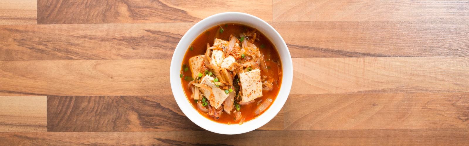 Are you a fan of hot-and-spicy? Then dig in to a bowl of kimchi soondubu jjigae, a simple warming stew of kimchi, onions, tofu, and a shiitake mushroom broth.